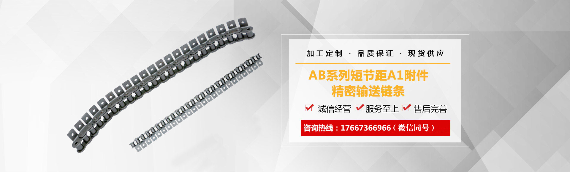 1、链条产品有各种不锈钢、碳钢输送链条、双节距输送链条、空心销轴链条、不锈钢塑料平顶链、不锈钢精密滚子链、特殊工矿输送链、耐高温输送链条、非标链条、弯板非标链条、大节距输送链条、各种链条用滚子(材质碳钢、不锈钢)等。